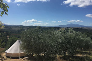Tents are set in our organic olive grove and have breathtaking views over vineyards and the medieval village of Pienza. The simple and chic interiors are designed by the architect/owner.